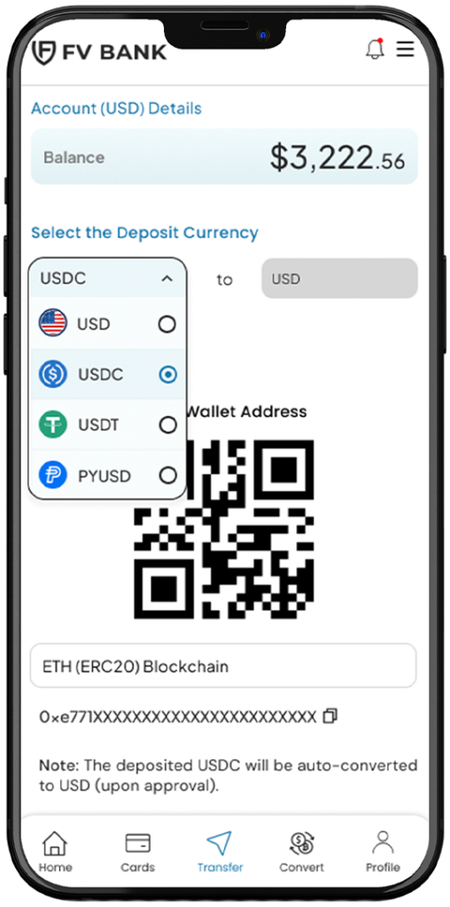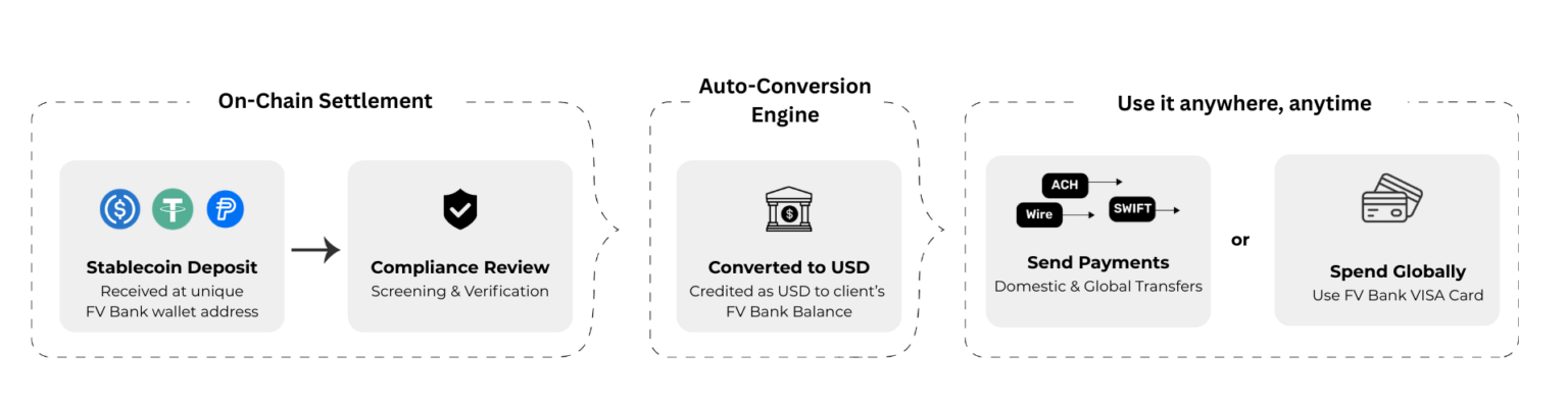 When stablecoins are received, they move through FV Bank’s standard transaction review processes, the same disciplined controls applied across all banking activities, before being automatically converted to USD and credited to the customer’s bank balance.