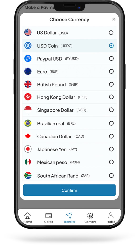 Conversely, customers can initiate stablecoin payments directly from their USD balance. When a stablecoin transfer is selected, the required USD amount is automatically converted into the chosen stablecoin and transferred to the beneficiary’s wallet address.